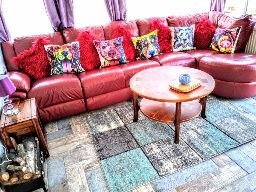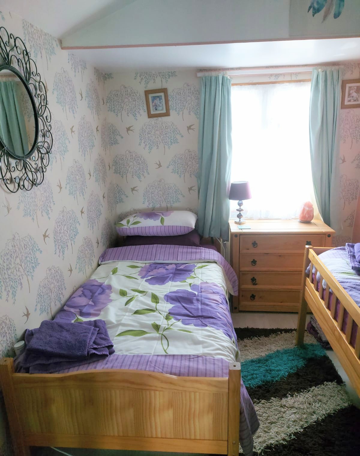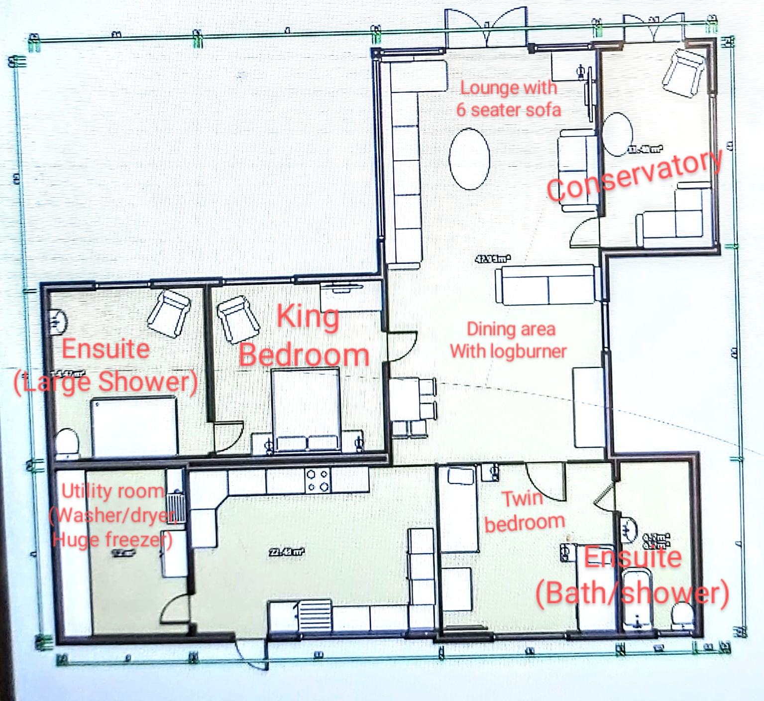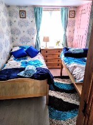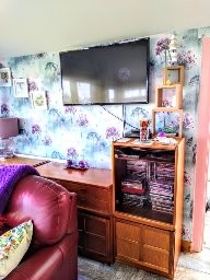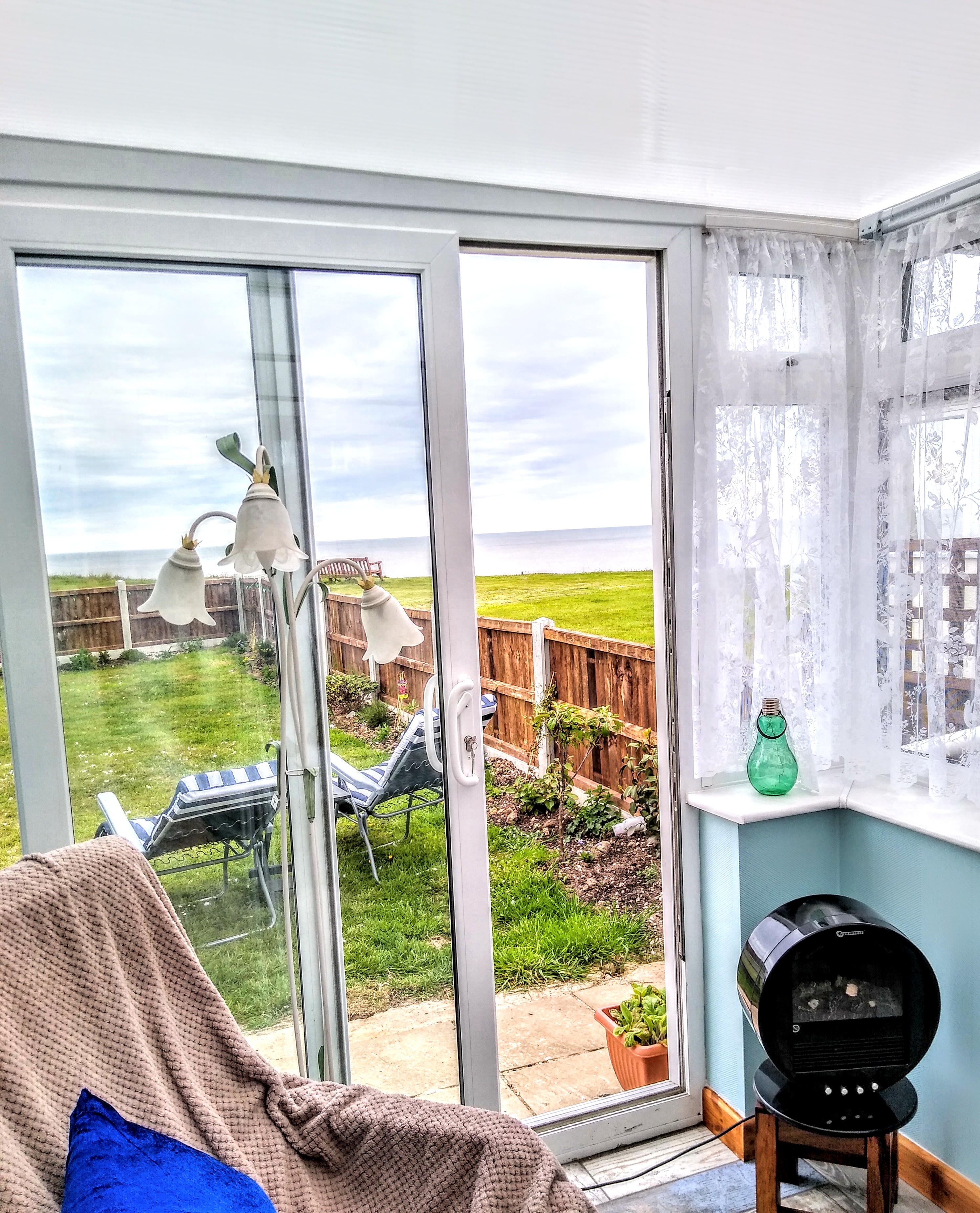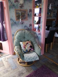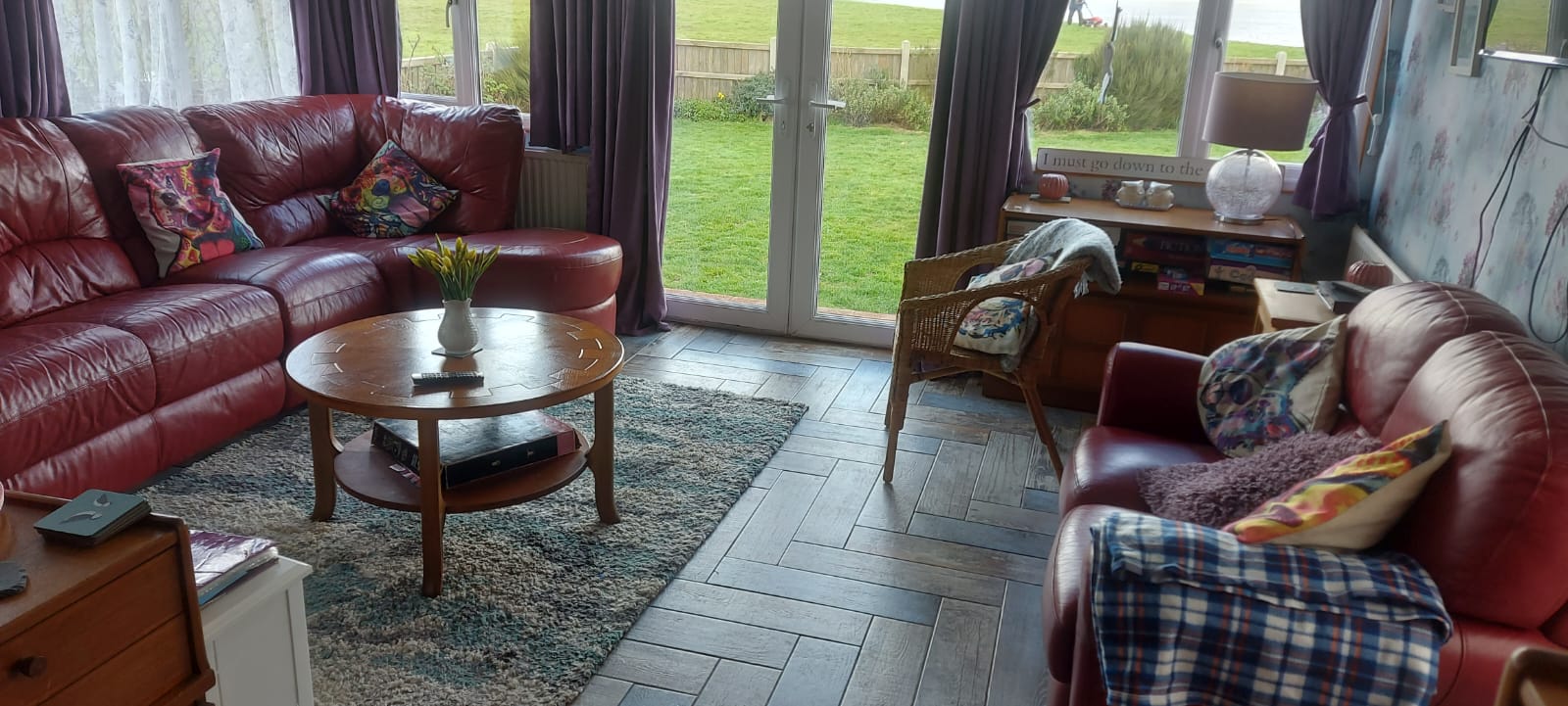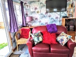 The living room is a long open-plan space with a dining area and a 6-8 seat couch along one wall with two smaller sofas, logburner, 42 inch smart tv/dvd player and bluetooth music system, with patio doors leading out to the garden and a sun-room with lots of board games/books/dvds if the weather isn’t so good.
