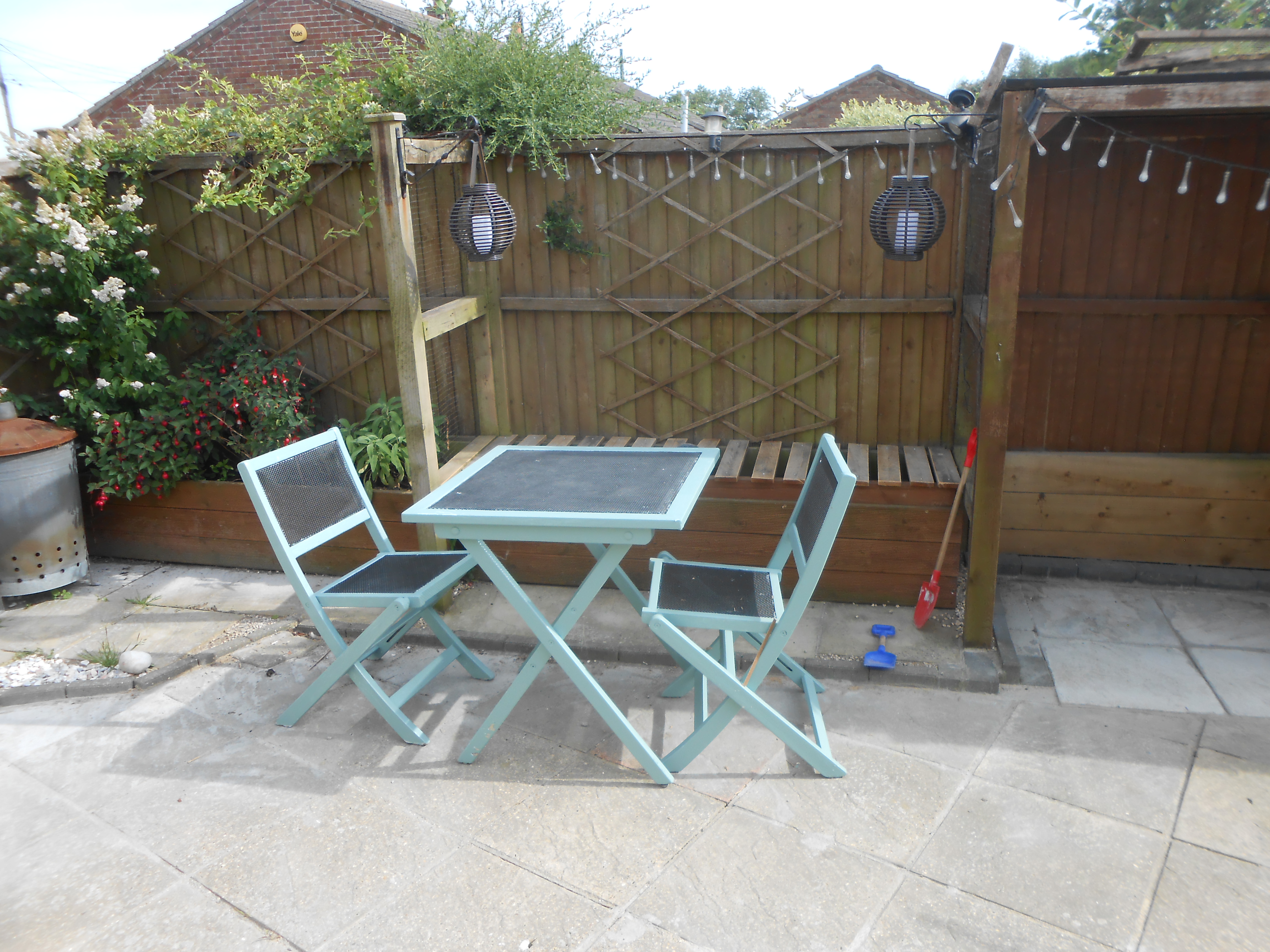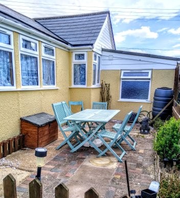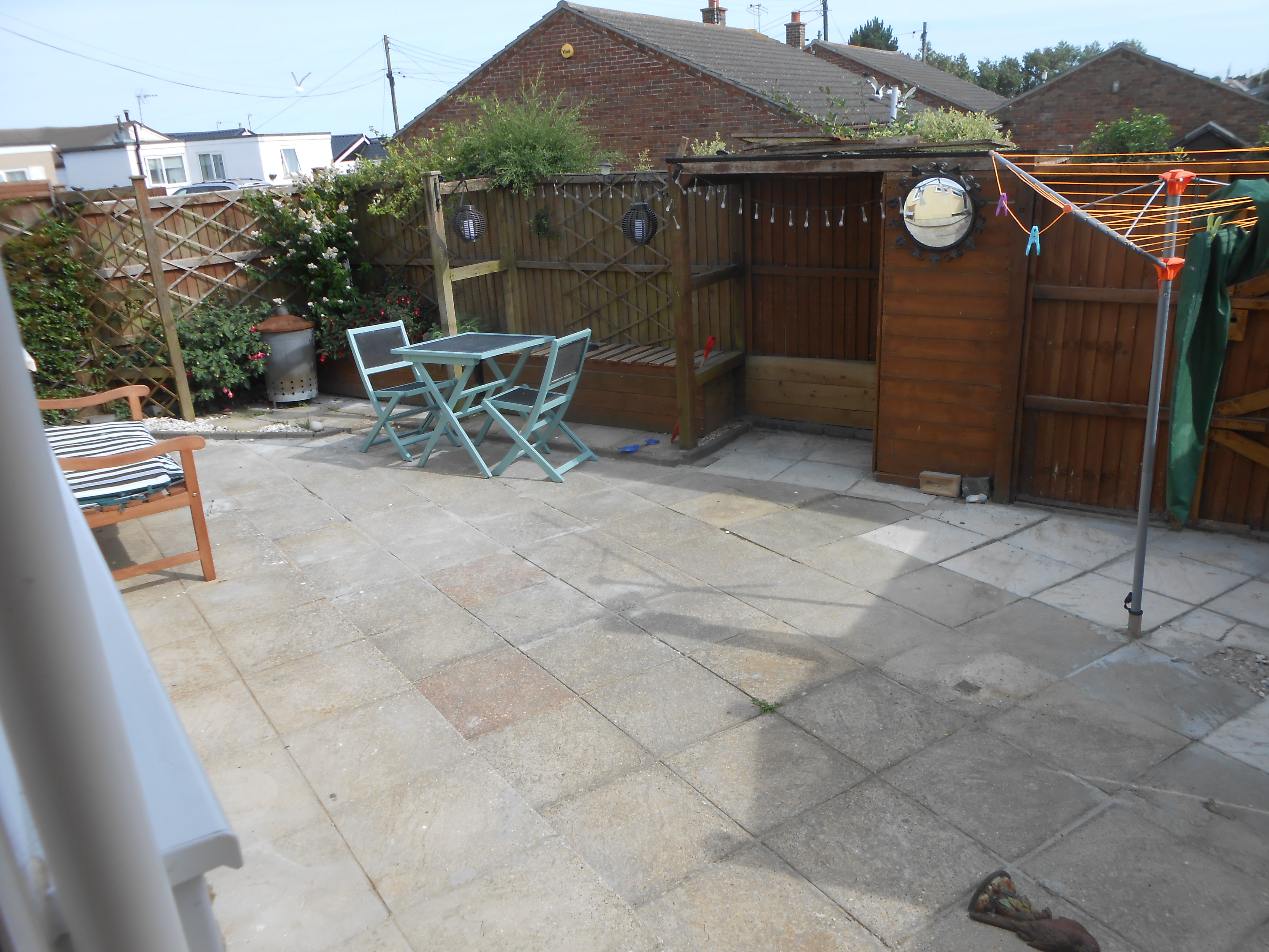 The back garden is lawn with a patio area with table/chairs and 4 loungers. There is an outside sprinkler for showering off sandy paws.